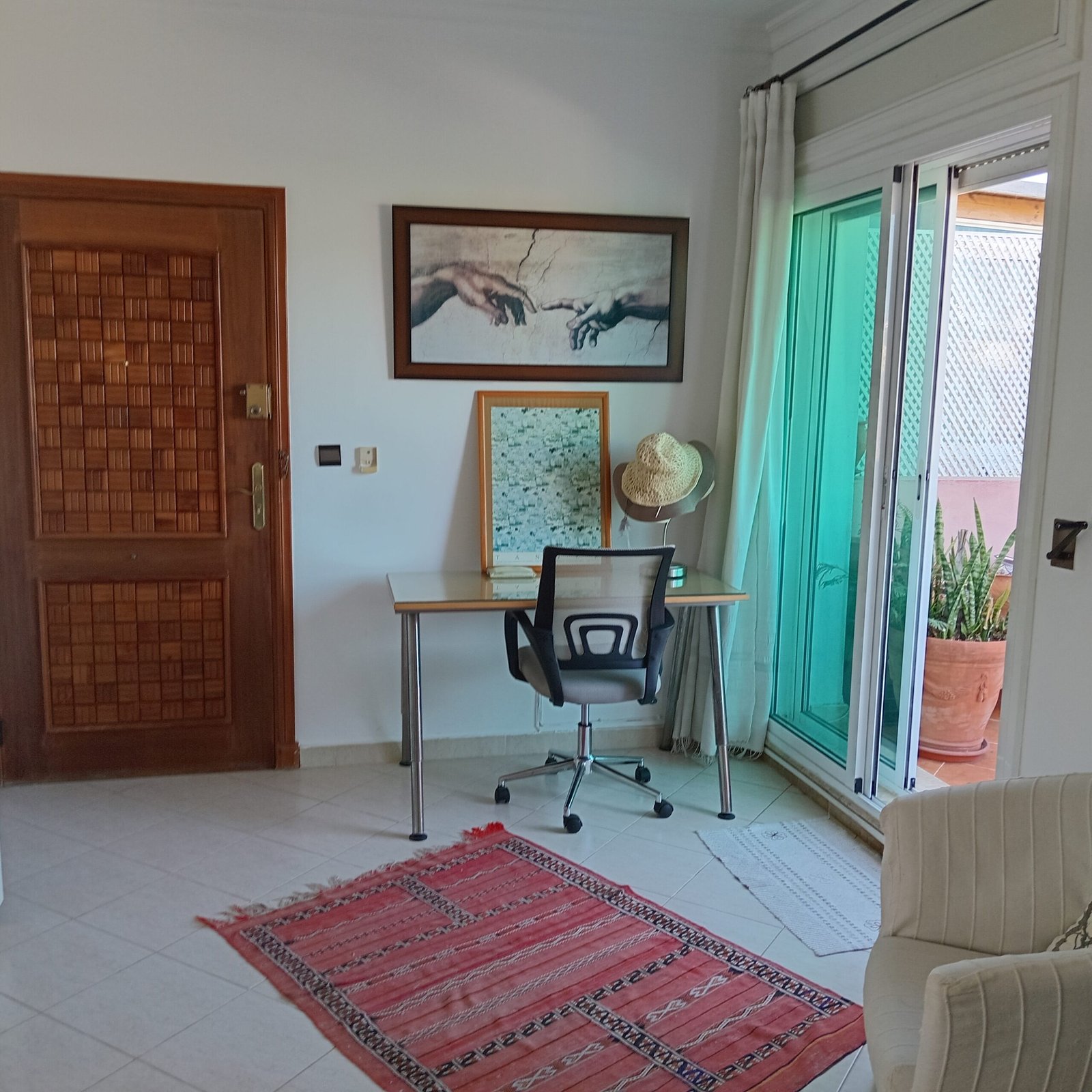 Très bien ensoleillé, cet appartement fait une surface habitable de 80 m² avec une terrasse vue dégagé sur le Palais Moulay Hafid de 8m². L’appartement est composé de :