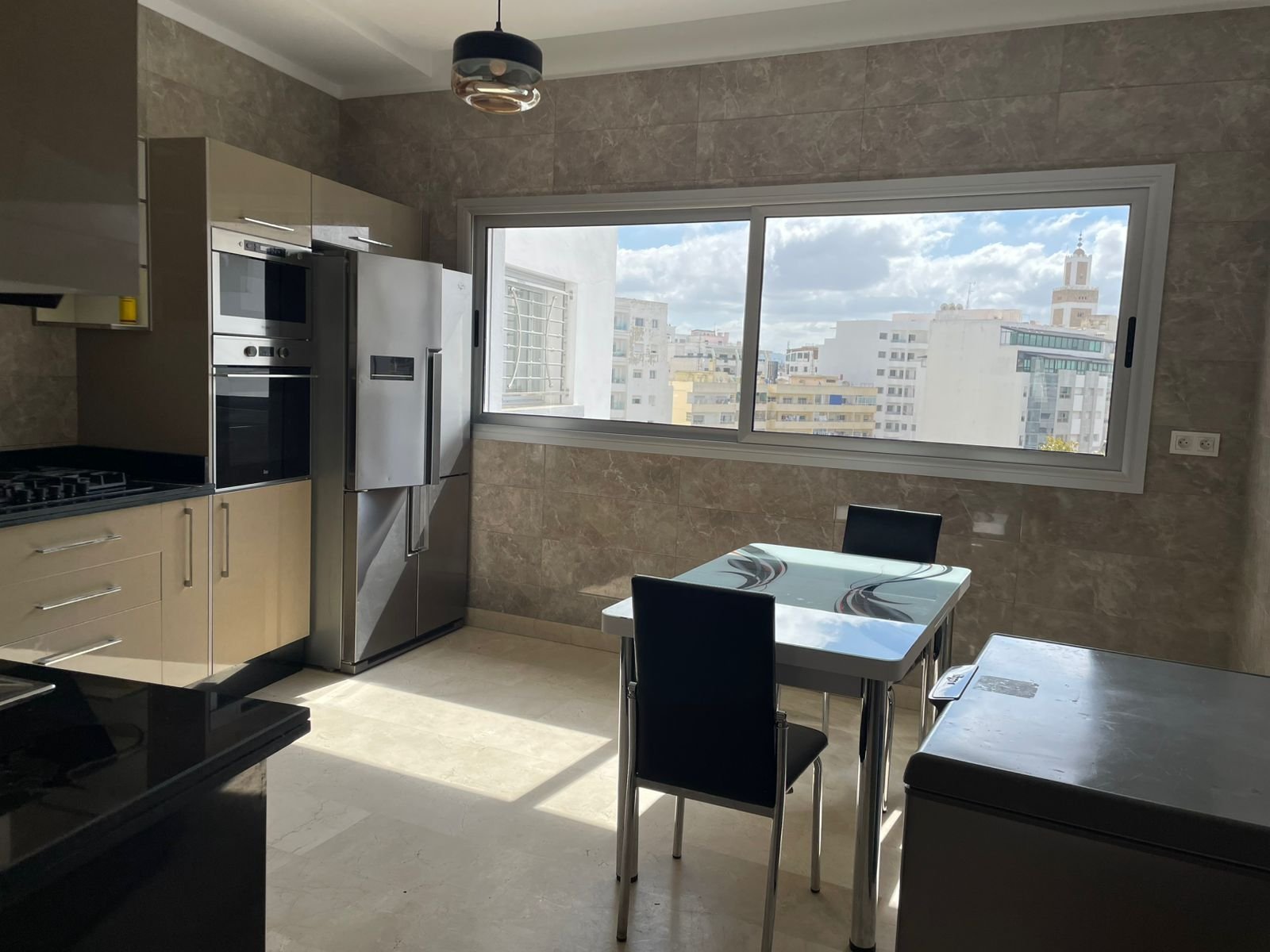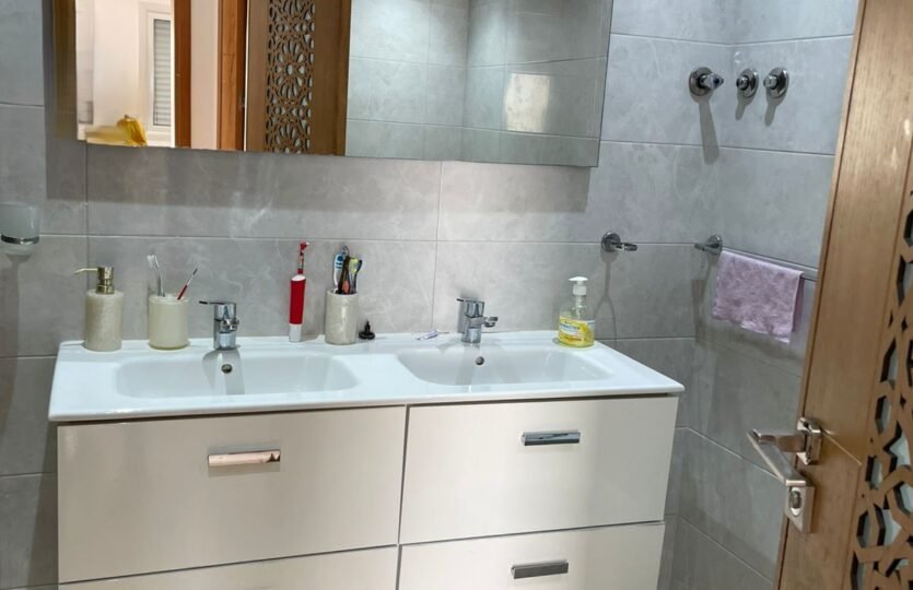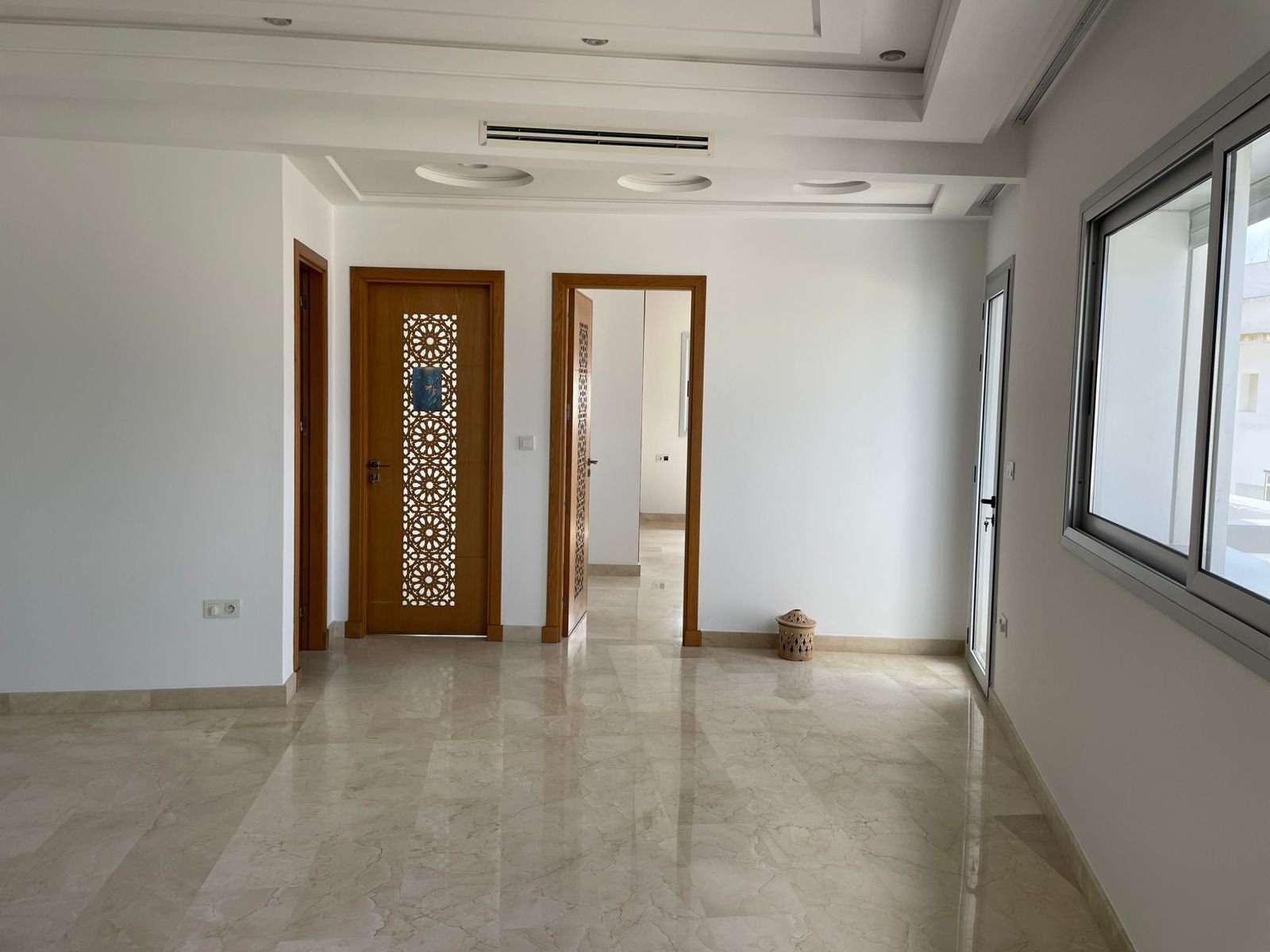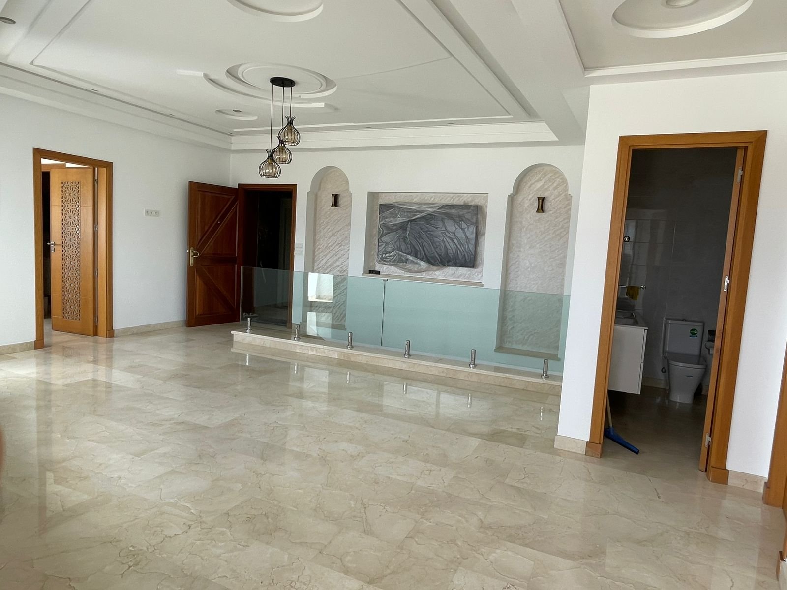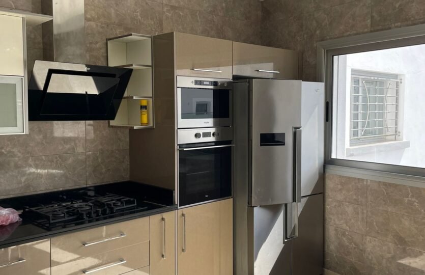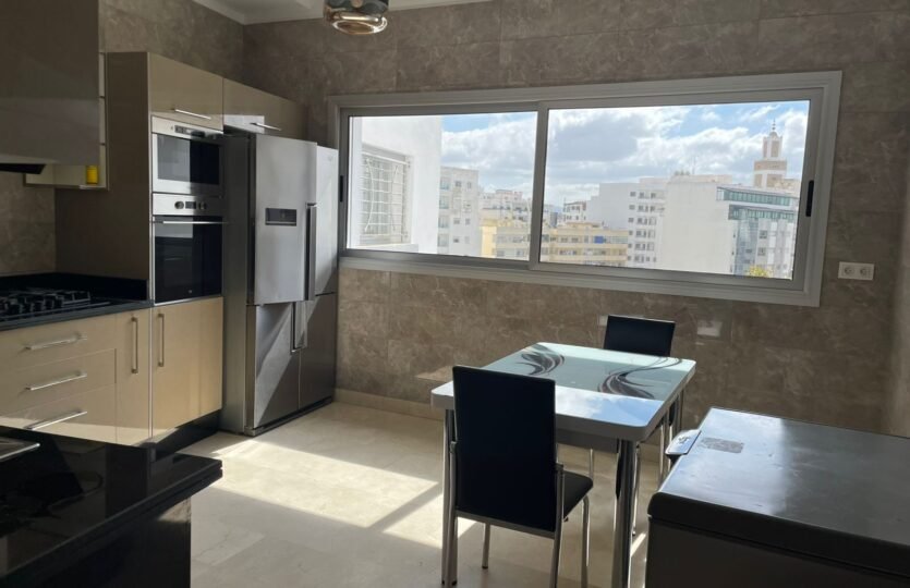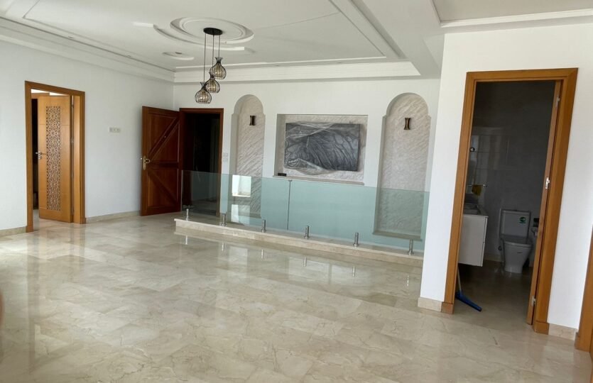 Avec une surface de 340m² plus ou moins, très bien agencé et lumineux, situé dans un immeuble récent au quartier Iberia, adresse recherché à Tanger à proximité des écoles et tous les services quotidiens, ce bien est composé de :